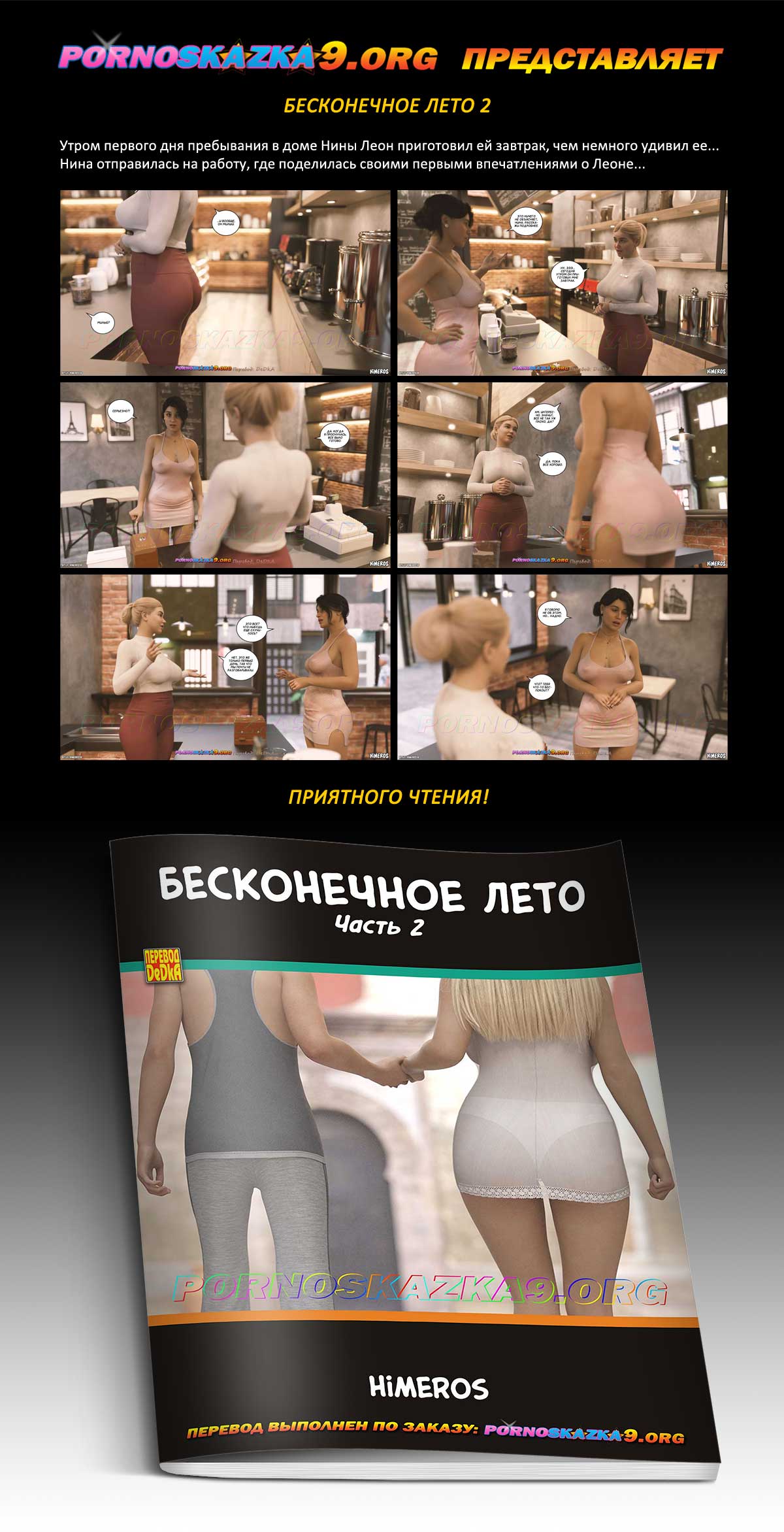 Порно комикс «Бесконечное лето. Часть 2.» Утром первого дня пребывания в доме Нины Леон приготовил ей завтрак, чем немного удивил ее… Нина отправилась на работу, где поделилась своими первыми впечатлениями о Леоне…